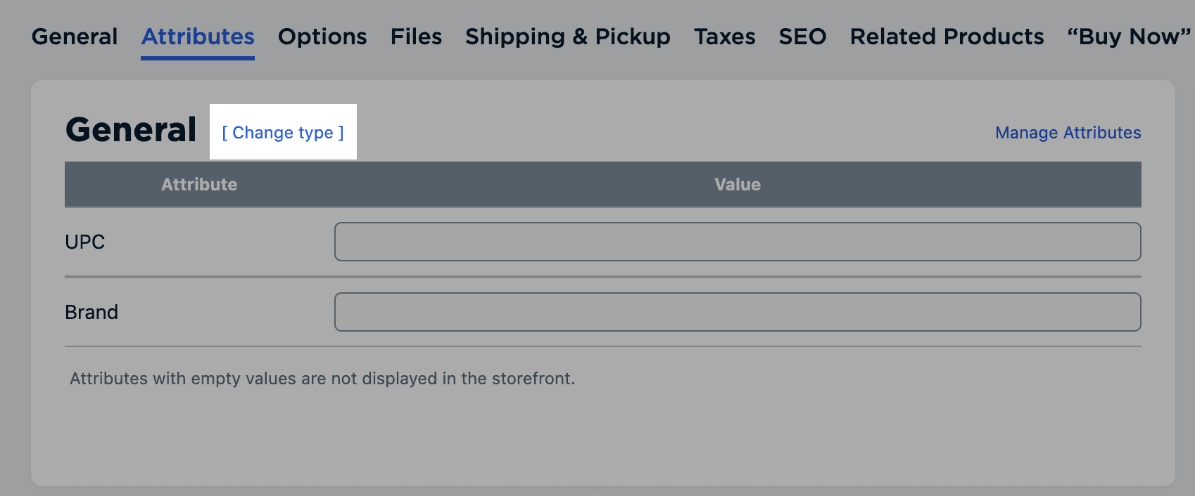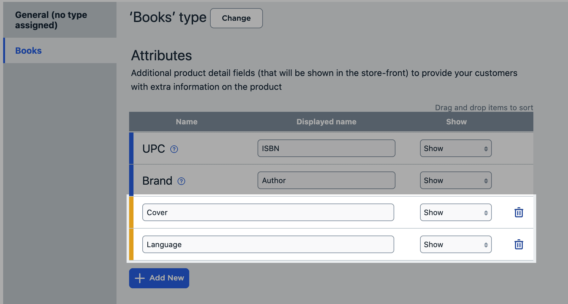 You can adjust attributes for any product type (including the default General type): edit their display name and visibility on the storefront, as well as add new custom attributes. This way, you can create a unique set of attributes for a particular product type based on your needs.