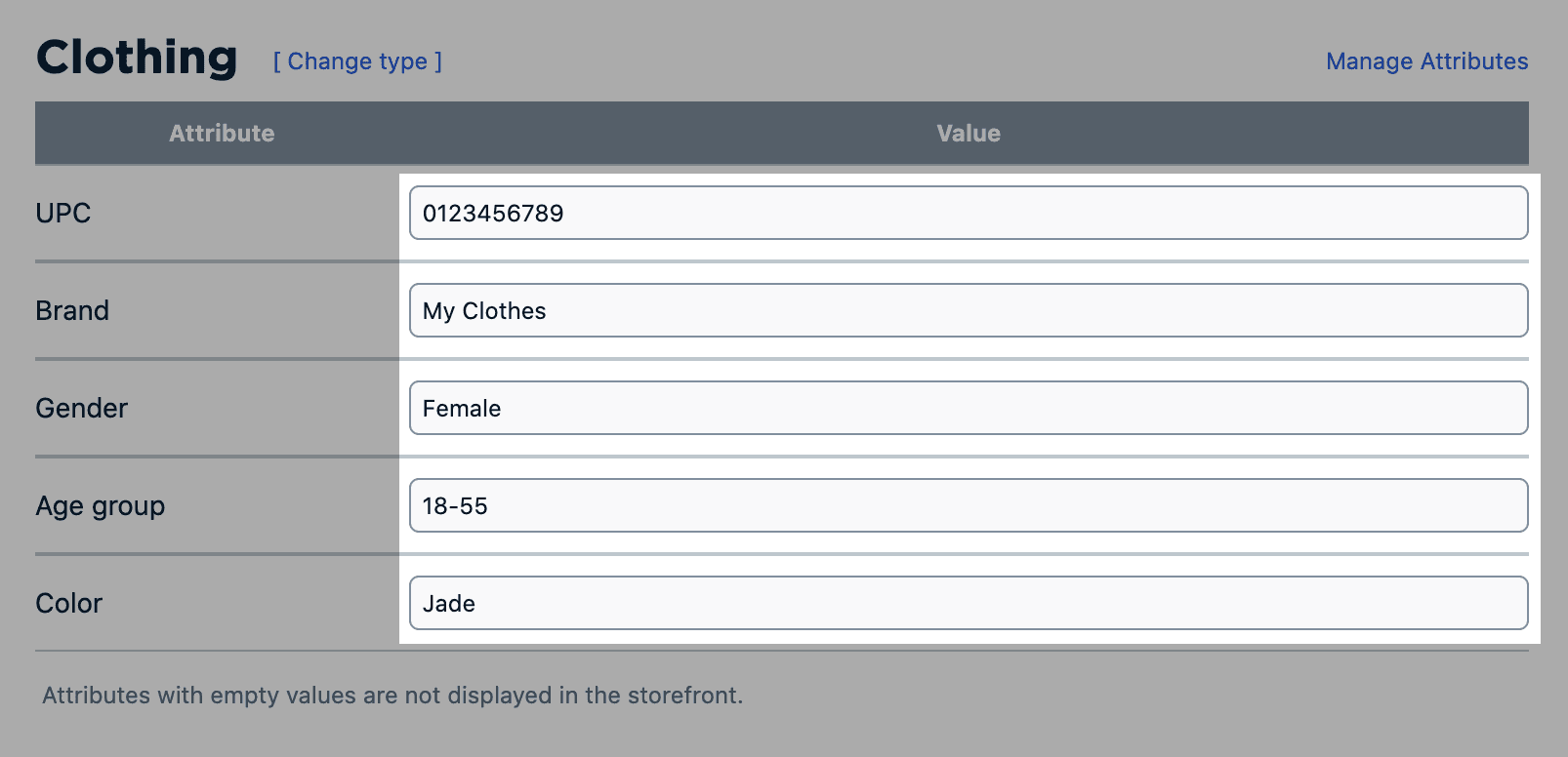 Each product type in your store can have its own set of attributes, including the custom ones you create yourself. For example, type Books with the following attributes: ISBN, publisher, language, age limit, and cover; or type Clothing with the gender, age group, color, and size attributes.