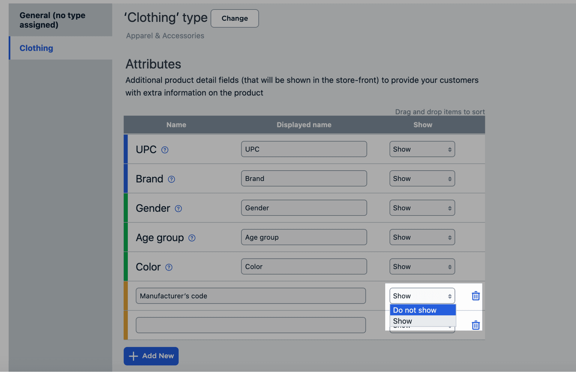 To hide some of the attributes from customers, select Do not show in the Show dropdown. Hidden attributes will be displayed in your store admin only and will remain invisible on the product details page.