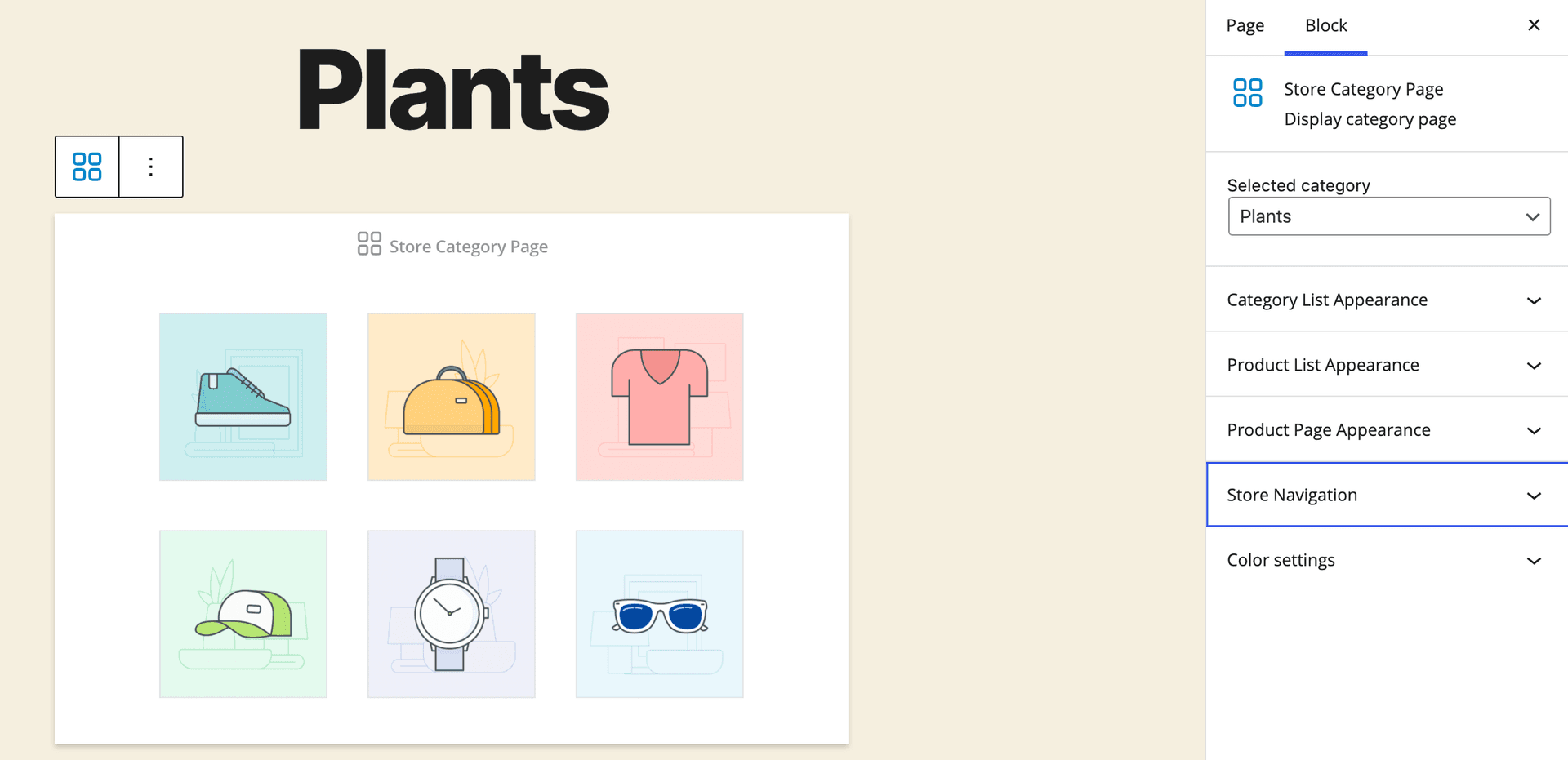 - If necessary, customize this category’s design (these changes won’t affect other categories) – select the block with the store category to see its settings and choose from the design options in the Block on the right: