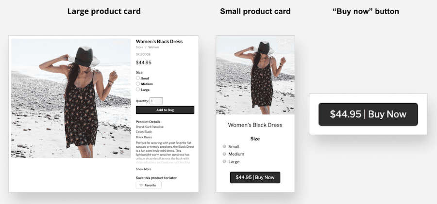 - Depending on how you want to represent a product, click on the appropriate block: Product Card Large (it includes product description and gallery), Product Card Small or Buy Button.