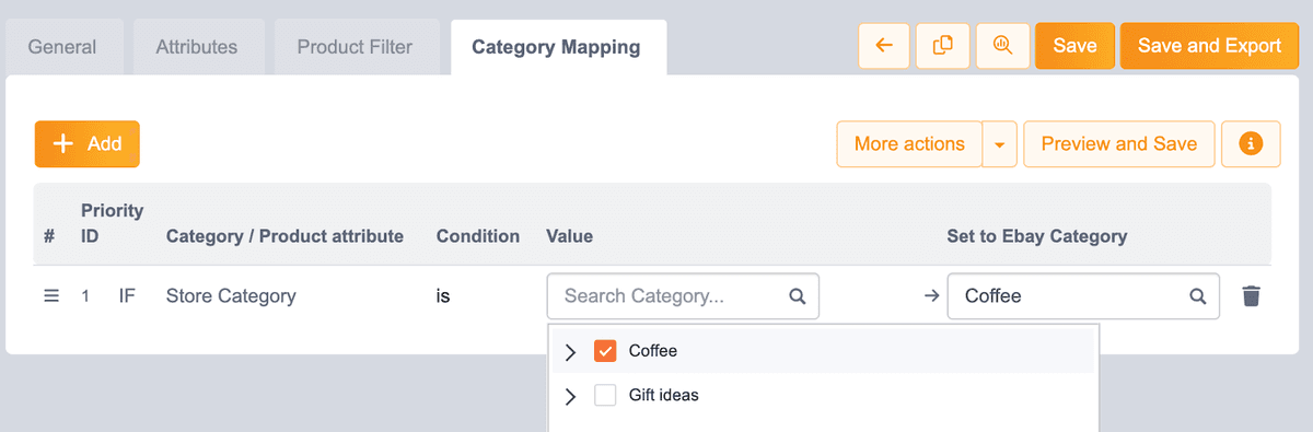 Click Add and then select the category you want to match. For example, Coffee. In the Set to Ebay Category, select the corresponding category: