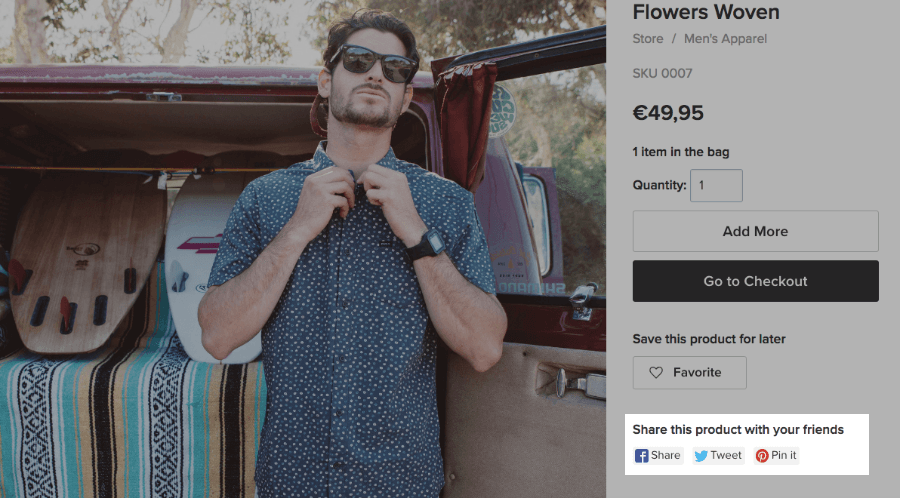 You can set up social sharing on Facebook, Twitter, and Pinterest to encourage people to share your products.