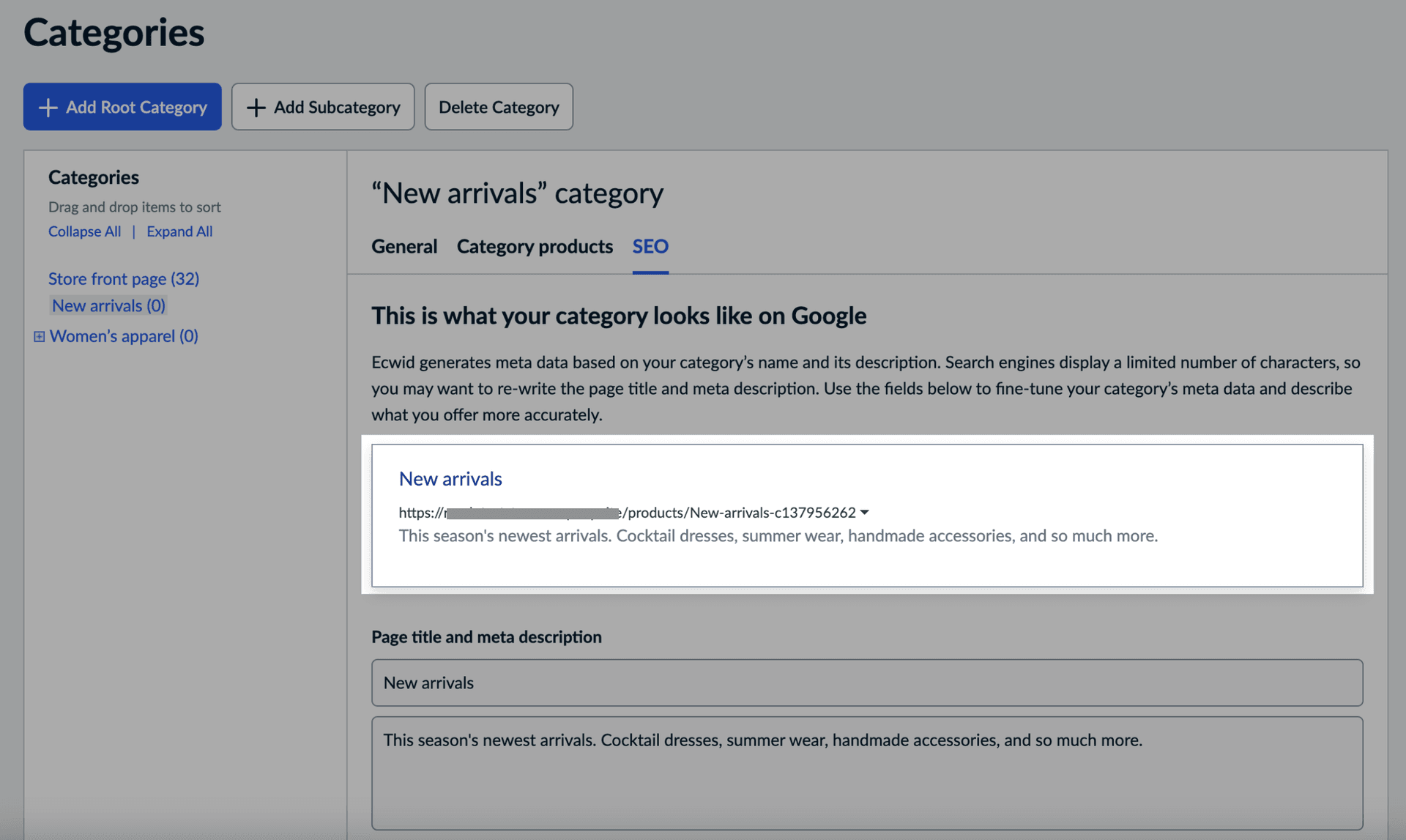 Categories allow you to organize products in your store and help visitors navigate the site. By default, we creates meta tags automatically from category names and descriptions. You can add custom meta tags to individual product categories to make them look more attractive to potential customers on the search results page.