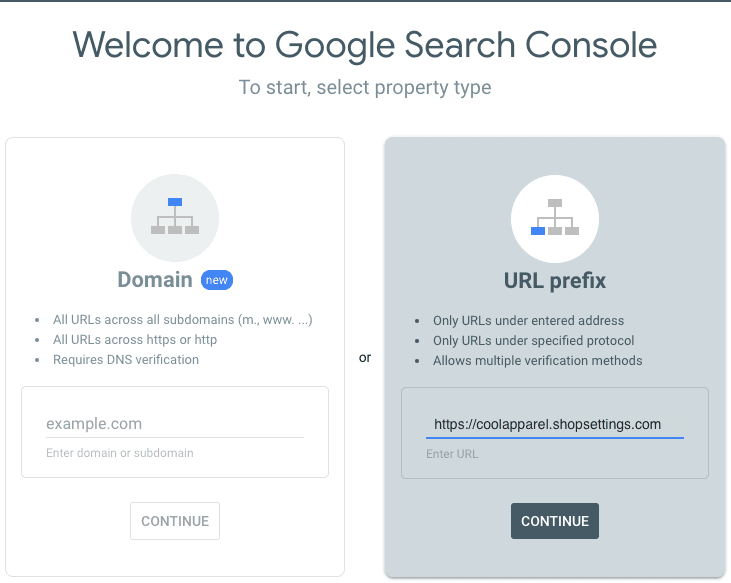 - Enter your site’s URL as a new property of the selected type, then click Continue.