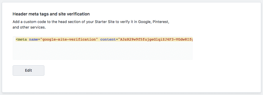- Scroll down to the Header meta tags and site verification section and paste your meta tag there: