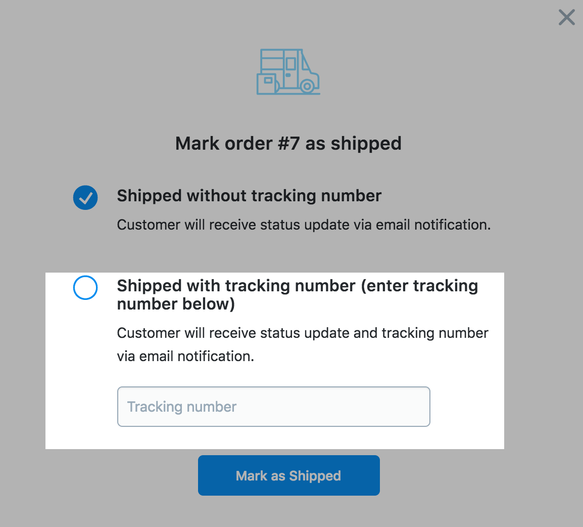 If you buy shipping labels from your store's admin, you can send the automated notification with the tracking number to your customers.