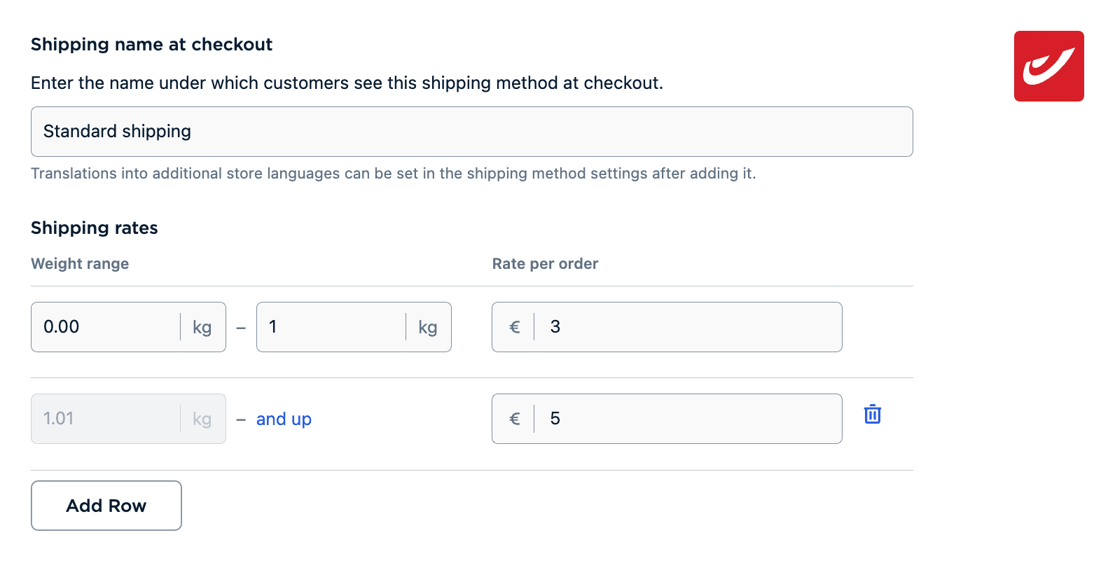 Shipping rates. For custom rates, specify what customers should pay for an order of a certain weight by adding weight ranges and respective rates: