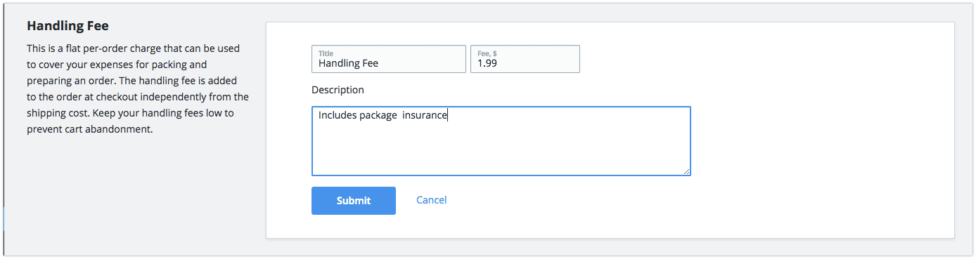 A handling fee is an additional charge explicitly added at checkout on top of the product price, taxes, and shipping costs. You can charge a handling fee if you want to cover the cost of any additional expenses related to the order fulfilment, e.g. shipping materials, gift wrap, parcel insurance, rush delivery, etc.