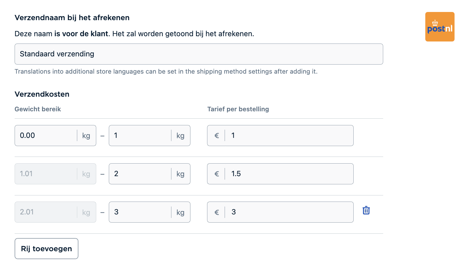 When you create the PostNL shipping method to your store, you can set up conditional free rates, flat or custom rates. You can manually add the PostNL rates that customers will see at checkout. PostNL rates for business (opens in a new tab) will help you charge shoppers accurately.