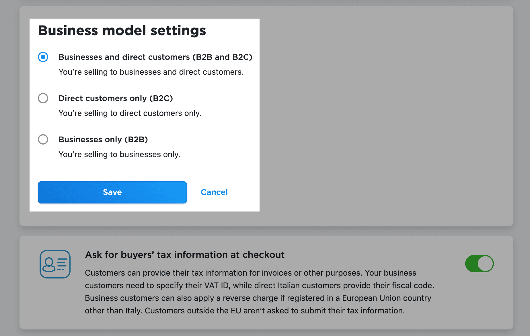 In the business model settings block, specify who your customers are: Businesses and direct customers (B2B and B2C), Direct customers only (B2C), or Businesses only (B2B):