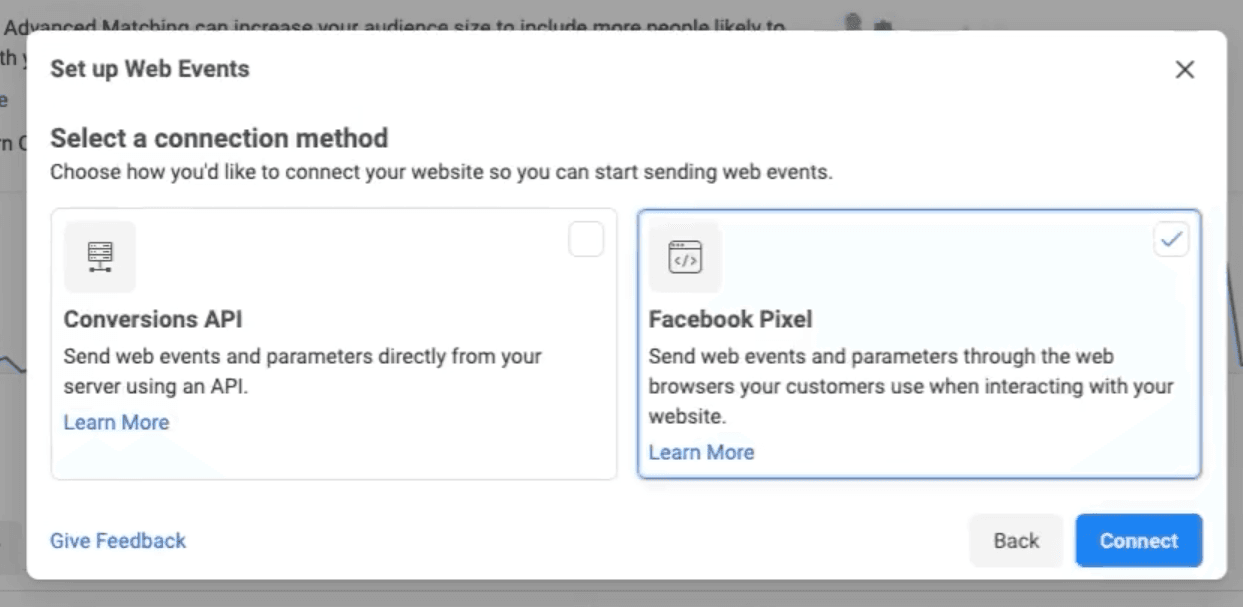 In the Set up Web Events window, select Facebook Pixel and click Connect: