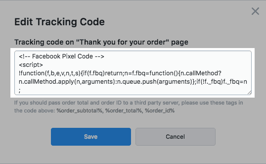 If you've used a Facebook pixel with your store in the past, you might need to remove its code before adding a new pixel, otherwise it may result in duplicated or partial data. From your store admin, go to Settings → General → Cart & Checkout and remove the Facebook pixel codes, if you have any, from the section Custom tracking code on Order Confirmation page: